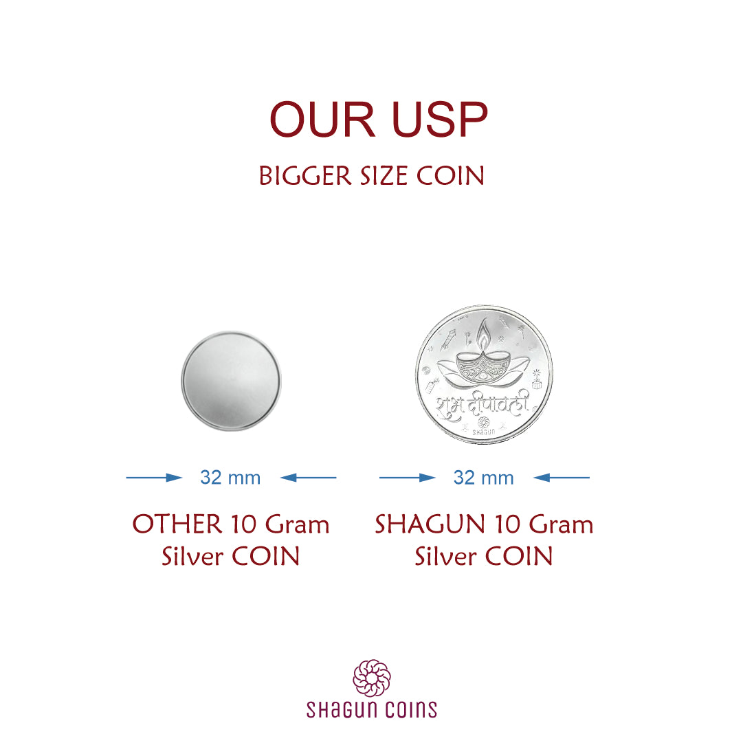 Unlike standard silver coins of the same weight, ours are crafted with a larger surface area, making them appear grander and more premium — without increasing the cost. Whether it’s a wedding, naming ceremony, housewarming, or festive celebration, this silver coin turns your blessings into something truly memorable.