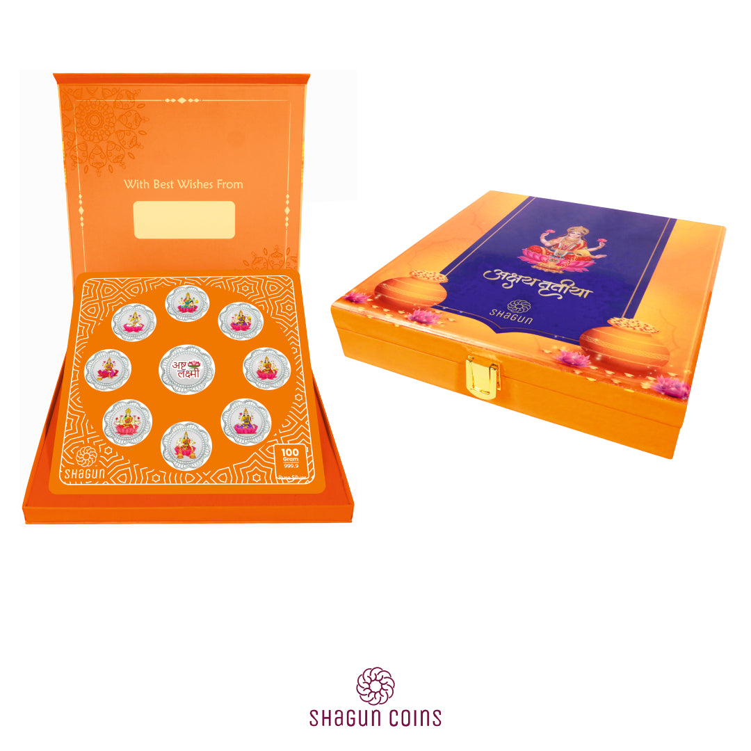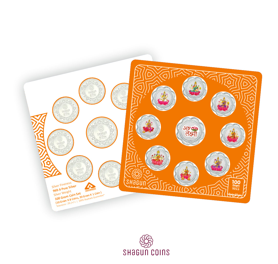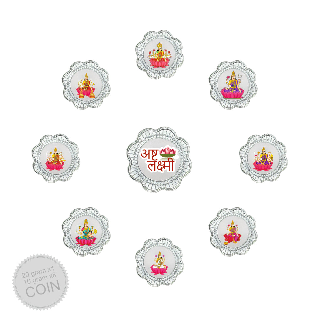 This thoughtfully curated pack includes 1 coin of 20 grams and 8 coins of 10 gram each, all made with high-purity silver and embossed with traditional motifs like Goddess Lakshmi — symbolising prosperity and auspiciousness.