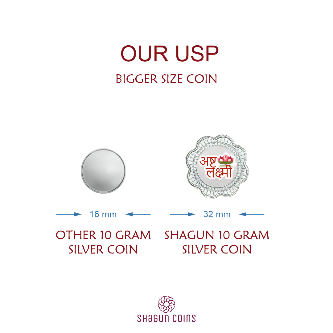 Each coin is designed with a larger surface area than standard coins of the same weight, giving them a standout, luxurious appearance. Whether it’s a wedding, baby shower, housewarming, festival, or return gift — this silver coin set expresses blessings more meaningfully than an envelope of money ever could.