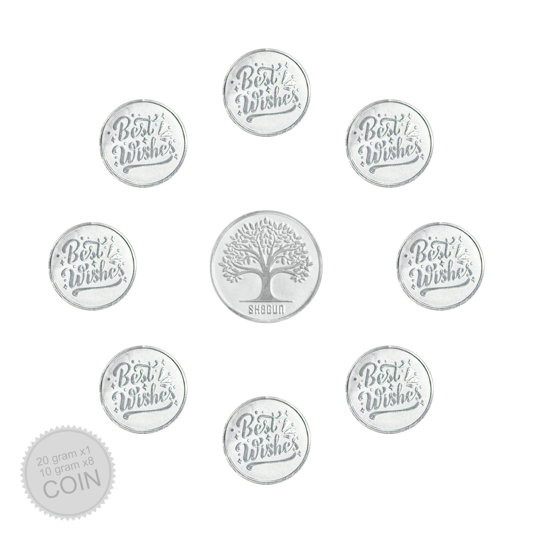 This thoughtfully curated pack includes 1 coin of 20 grams and 8 coins of 10 gram each, all made with high-purity silver and embossed with traditional motifs like Goddess Lakshmi — symbolising prosperity and auspiciousness.