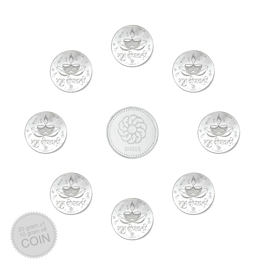 This thoughtfully curated pack includes 1 coin of 20 grams and 8 coins of 10 gram each, all made with high-purity silver and embossed with traditional motifs like Goddess Lakshmi — symbolising prosperity and auspiciousness.