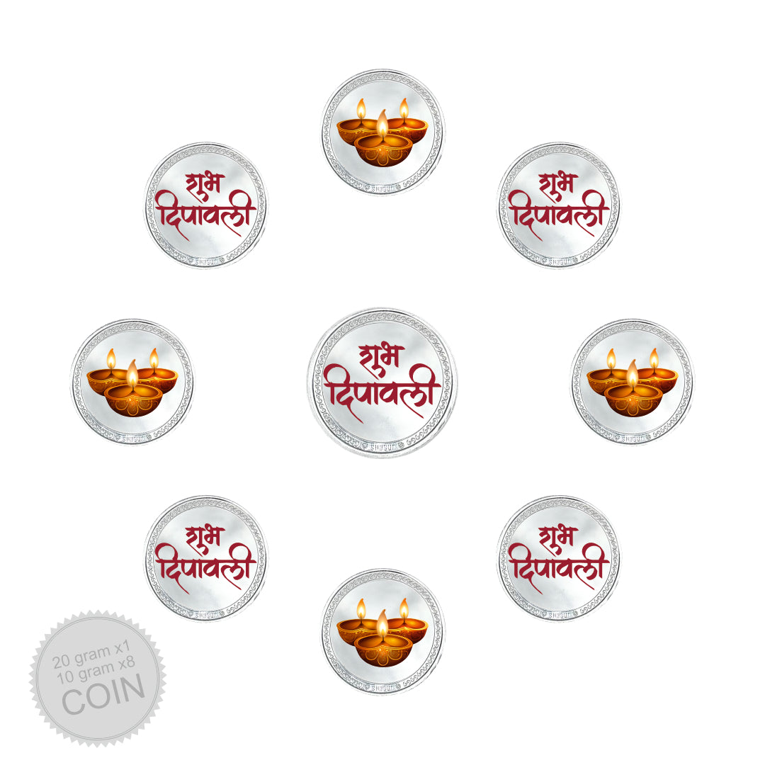This thoughtfully curated pack includes 1 coin of 20 grams and 8 coins of 10 gram each, all made with high-purity silver and embossed with traditional motifs like Goddess Lakshmi — symbolising prosperity and auspiciousness.