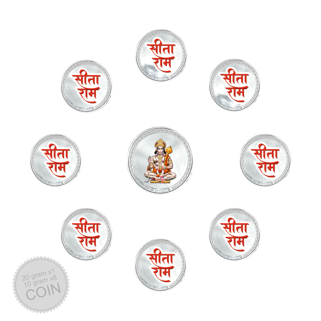 This thoughtfully curated pack includes 1 coin of 20 grams and 8 coins of 10 gram each, all made with high-purity silver and embossed with traditional motifs like Goddess Lakshmi — symbolising prosperity and auspiciousness.