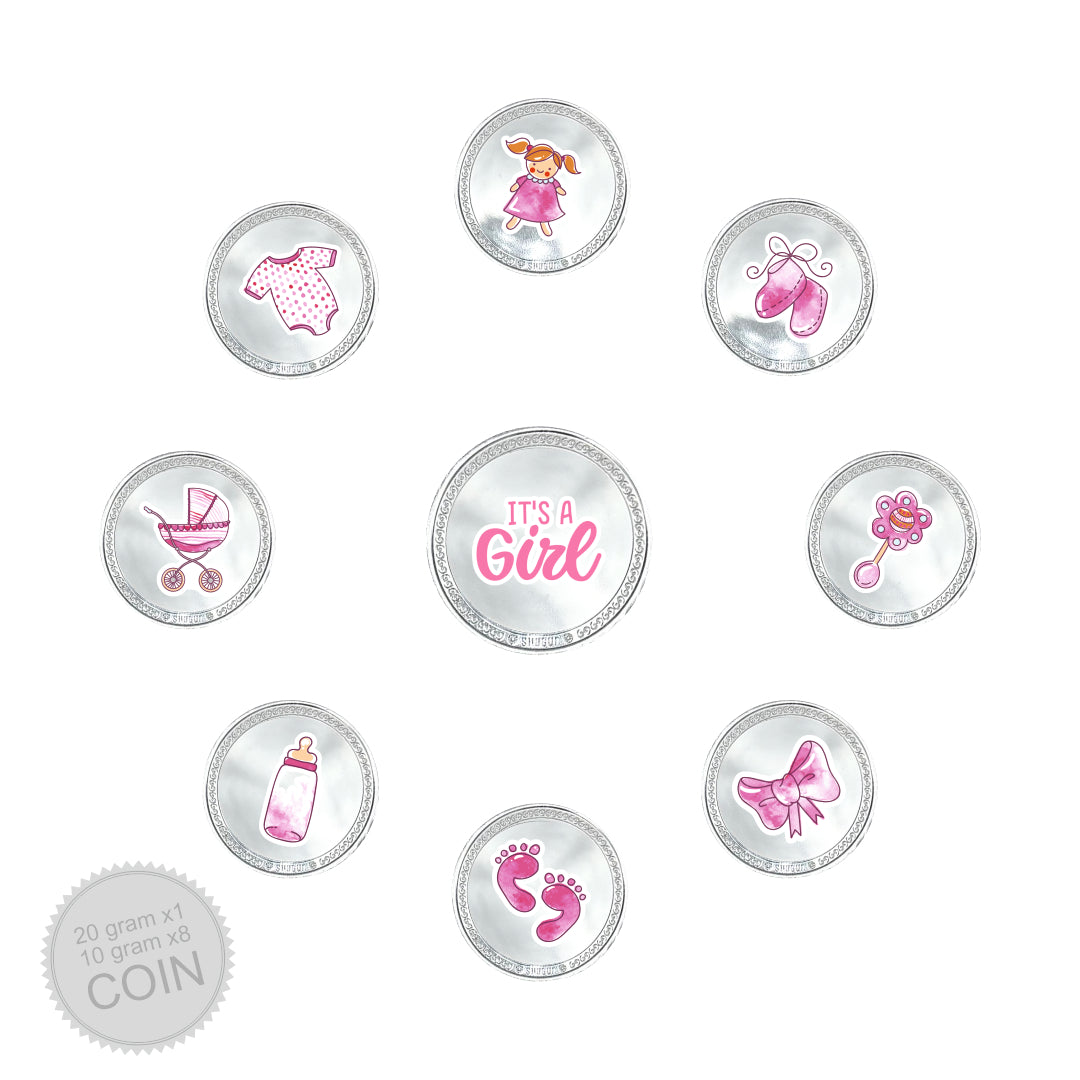 This thoughtfully curated pack includes 1 coin of 20 grams and 8 coins of 10 gram each, all made with high-purity silver and embossed with traditional motifs like Goddess Lakshmi — symbolising prosperity and auspiciousness.