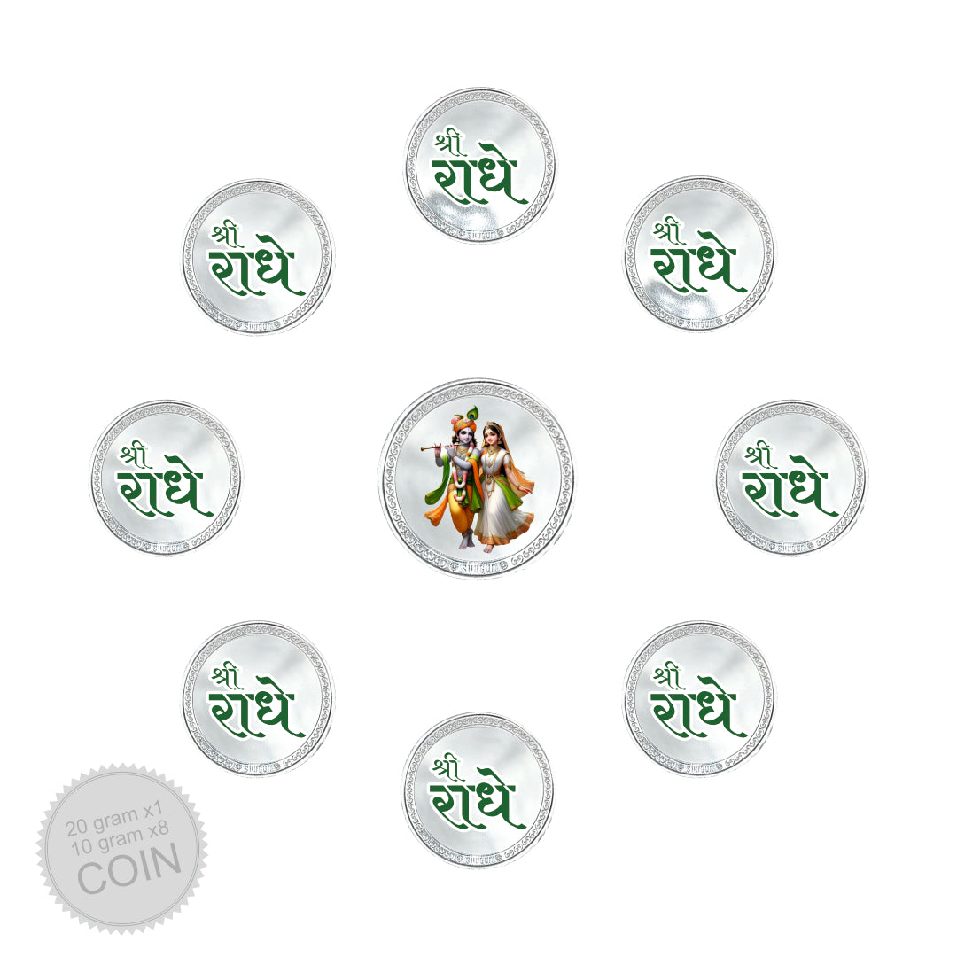 This thoughtfully curated pack includes 1 coin of 20 grams and 8 coins of 10 gram each, all made with high-purity silver and embossed with traditional motifs like Goddess Lakshmi — symbolising prosperity and auspiciousness.
