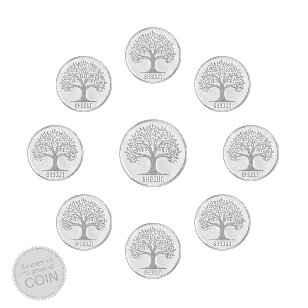 This thoughtfully curated pack includes 1 coin of 20 grams and 8 coins of 10 gram each, all made with high-purity silver and embossed with traditional motifs like Goddess Lakshmi — symbolising prosperity and auspiciousness.