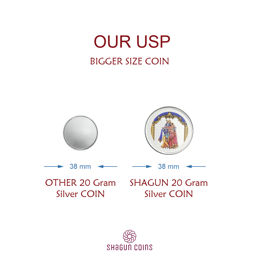 Unlike standard silver coins of the same weight, ours are crafted with a larger surface area, making them appear grander and more premium — without increasing the cost. Whether it’s a wedding, naming ceremony, housewarming, or festive celebration, this silver coin turns your blessings into something truly memorable.