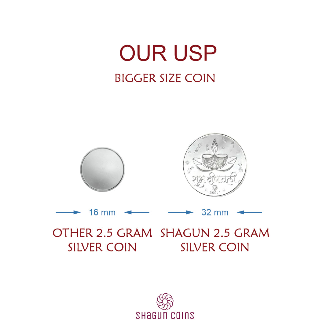 Unlike standard silver coins of the same weight, ours are crafted with a larger surface area, making them appear grander and more premium — without increasing the cost. Whether it’s a wedding, naming ceremony, housewarming, or festive celebration, this silver coin turns your blessings into something truly memorable.