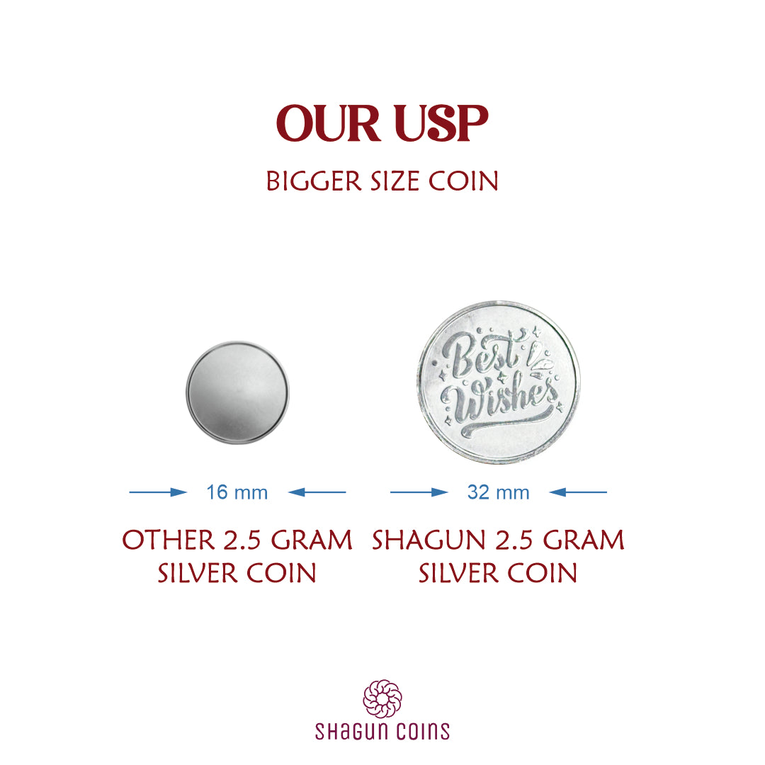Each coin is designed with a larger surface area than standard coins of the same weight, giving them a standout, luxurious appearance. Whether it’s a wedding, baby shower, housewarming, festival, or return gift — this silver coin set expresses blessings more meaningfully than an envelope of money ever could.
