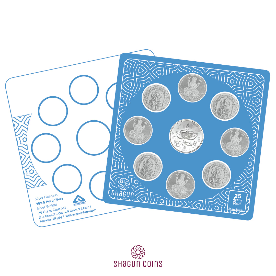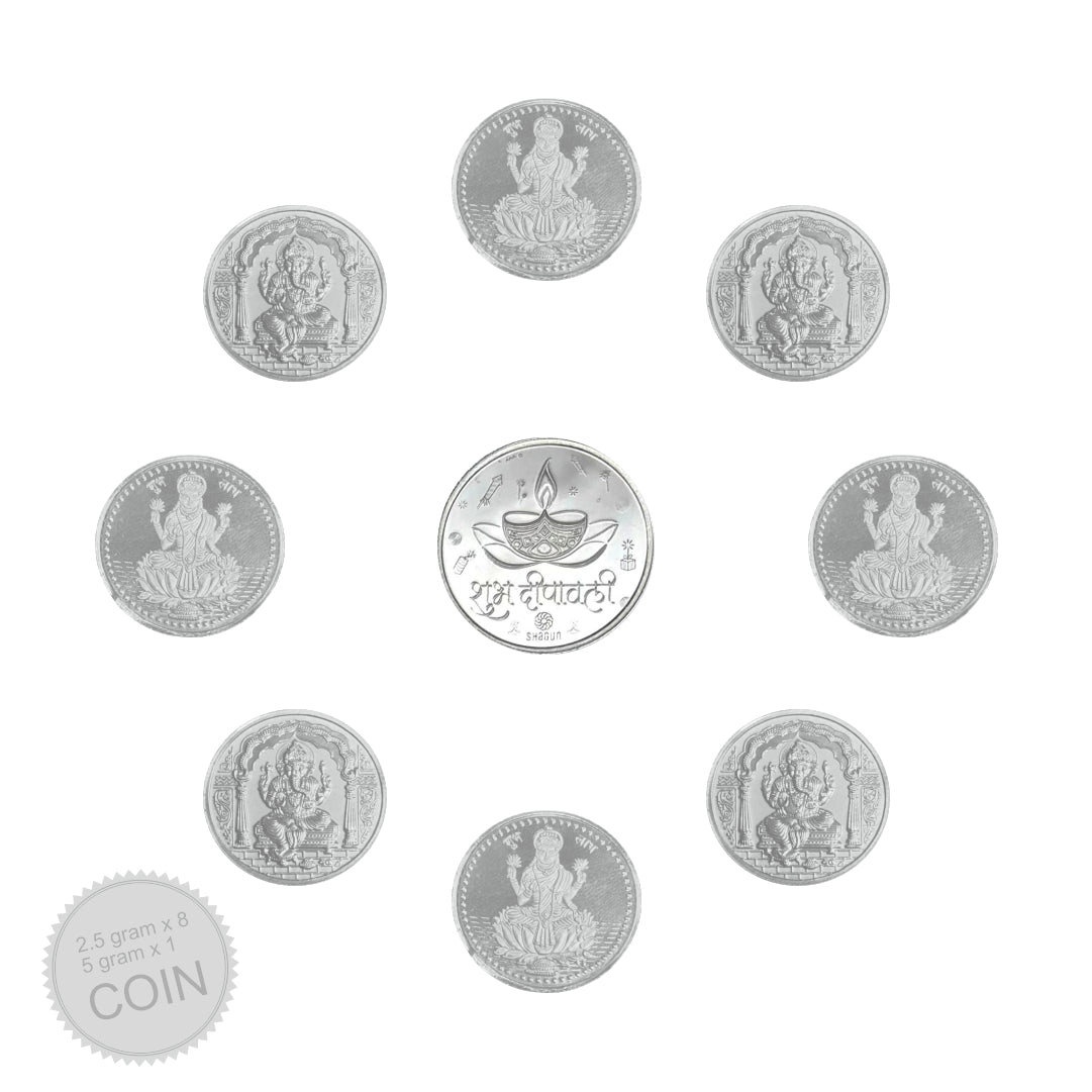 This thoughtfully curated pack includes 1 coin of 5 grams and 8 coins of 2.5 gram each, all made with high-purity silver and embossed with traditional motifs like Goddess Lakshmi — symbolising prosperity and auspiciousness.
